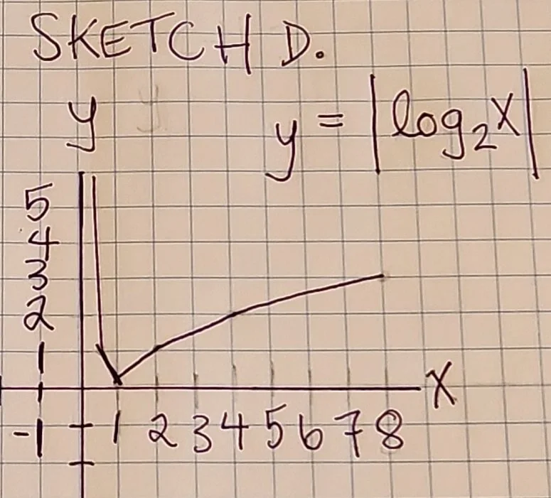 OK so we know a little about elementary logarithmic functions now, what happens when we combine them with another function … maybe our old friend the absolute-value function? (See Sketch D.)
